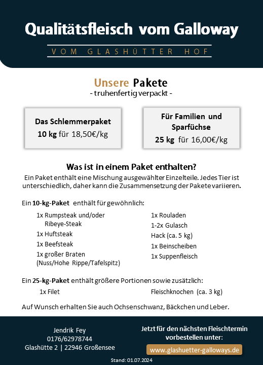 Unser Galloway Fleisch bieten wir in Paketen von 10 kg und 25 kg an. Die Pakete enthalten neben den Edelteilen des Rindes auch weniger bekannte, aber dennoch köstliche Stücke. So hast Du die Möglichkeit, das Tier als Ganzes kennenzulernen und zu schätzen.
