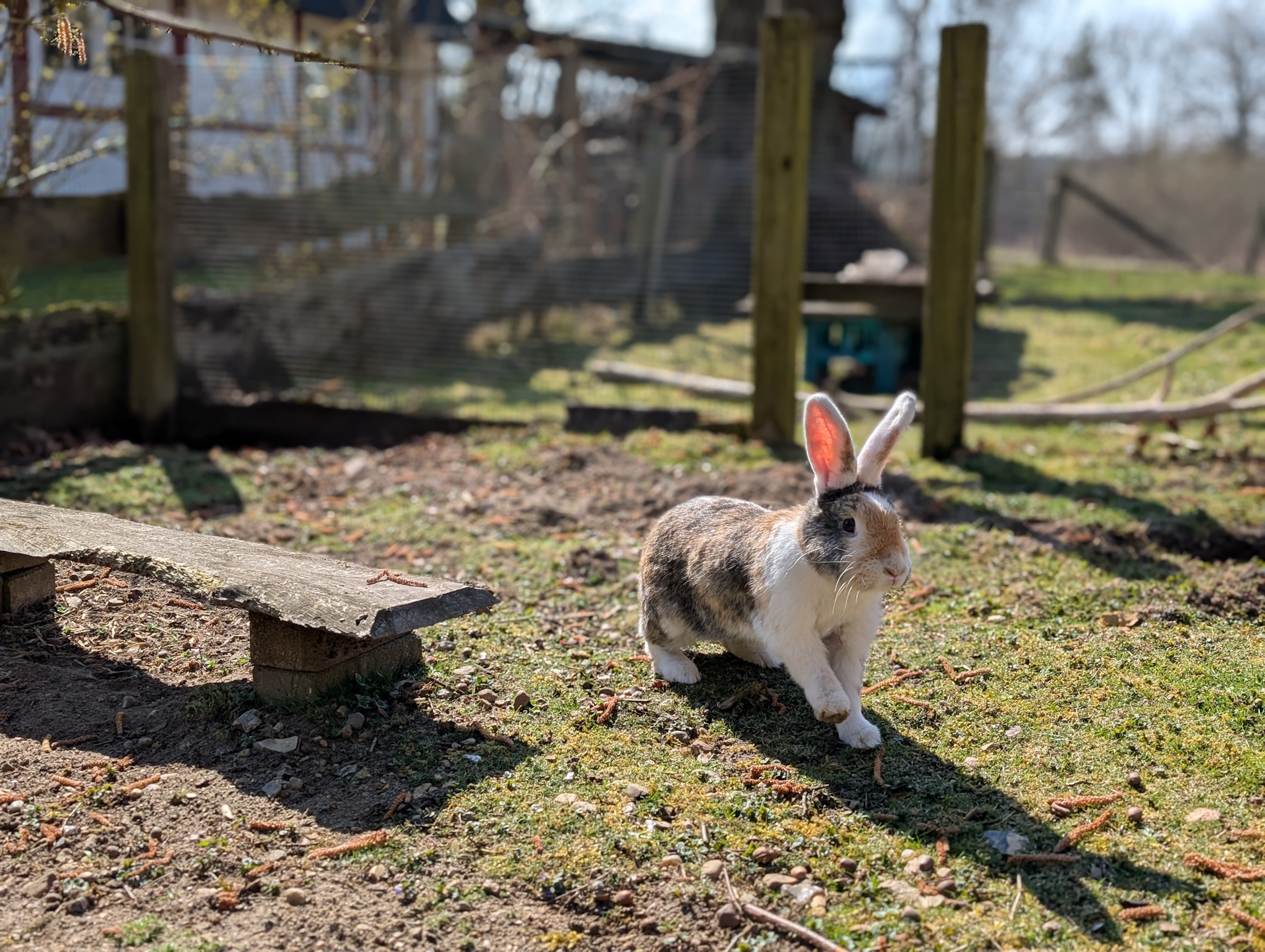 Und zu guter Letzt hat auch unser Hauskaninchen Alfa wieder eine Herzensdame gefunden. Die kleine Goldi füllt die Lücke, die unsere 10-Jährige Frieda hinterlassen hat. Auch wenn beide aktuell noch etwas schüchtern daherkommen, wird das großzügige Außengehege nun endlich wieder zu zweit unsicher gemacht.