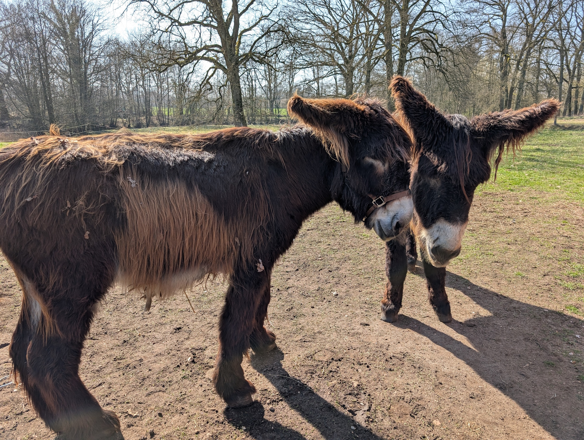 Außerdem ist am 30. März Filou zu uns gezogen. Der 10 Jahre alte Poitou Esel, bisher als Kölner Jung unterwegs, streift jetzt gemeinsam mit seinem neuen Freund, unserem 14-jährigen Poitou Balto über die hiesigen Wiesen.